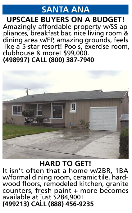 SANTA ANA UPSCALE BUYERS ON A BUDGET! Amazingly affordable property w/SS appliances, breakfast bar, nice living room & dining area w/FP, amazing grounds, feels like a 5-star resort! Pools, exercise room, clubhouse & more! $99,000. (498997) CALL (800) 387-7940 HARD TO GET! It isn’t often that a home w/2BR, 1BA w/formal dining room, ceramic tile, hardwood floors, remodeled kitchen, granite counters, fresh paint + more becomes available at just $284,900! (499213) CALL (888) 456-9235