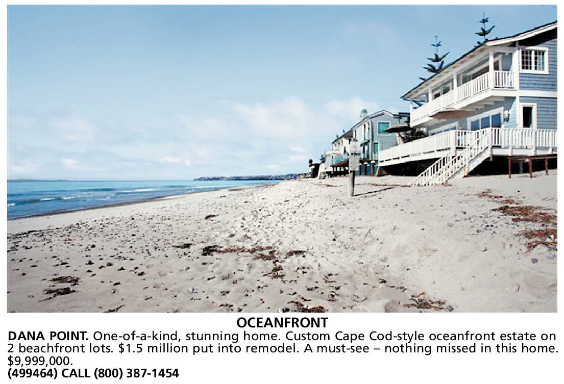 OCEANFRONT DANA POINT. One-of-a-kind, stunning home. Custom Cape Cod-style oceanfront estate on 2 beachfront lots. $1.5 million put into remodel. A must-see – nothing missed in this home. $9,999,000. (499464) CALL (800) 387-1454
