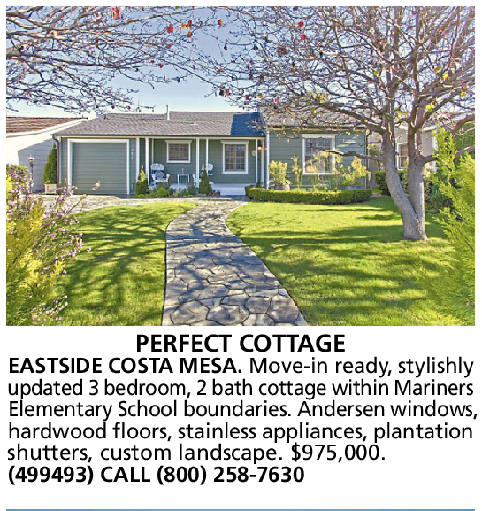 PERFECT COTTAGE EASTSIDE COSTA MESA. Move-in ready, stylishly updated 3 bedroom, 2 bath cottage within Mariners Elementary School boundaries. Andersen windows, hardwood floors, stainless appliances, plantation shutters, custom landscape. $975,000.