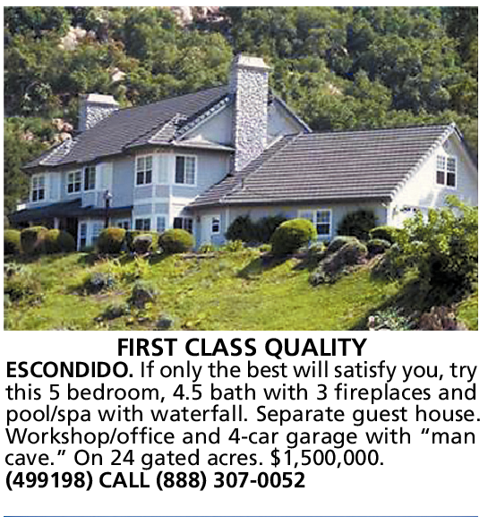 FIRST CLASS QUALITY ESCONDIDO. If only the best will satisfy you, try this 5 bedroom, 4.5 bath with 3 fireplaces and pool/spa with waterfall. Separate guest house. Workshop/office and 4-car garage with “man cave.” On 24 gated acres. $1,500,000.