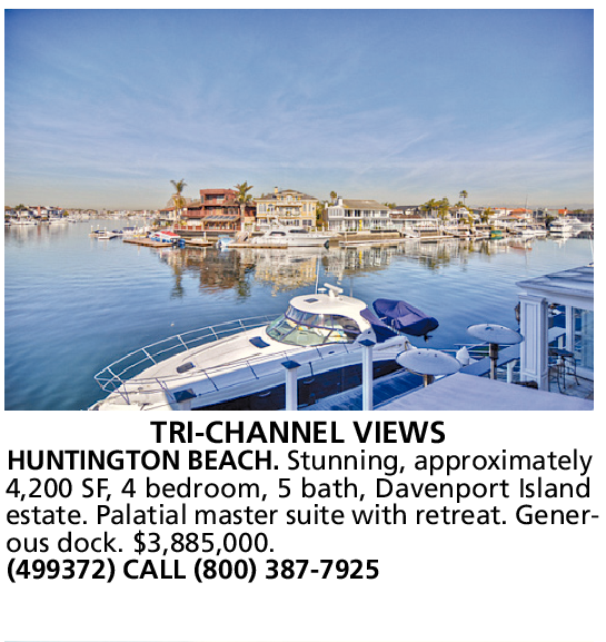 TRI-CHANNEL VIEWS HUNTINGTON BEACH. Stunning, approximately 4,200 SF, 4 bedroom, 5 bath, Davenport Island estate. Palatial master suite with retreat. Generous dock. $3,885,000.