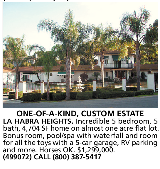 ONE-OF-A-KIND, CUSTOM ESTATE LA HABRA HEIGHTS. Incredible 5 bedroom, 5 bath, 4,704 SF home on almost one acre flat lot. Bonus room, pool/spa with waterfall and room for all the toys with a 5-car garage, RV parking and more. Horses OK. $1,299,000. (499072) CALL (800) 387-5417