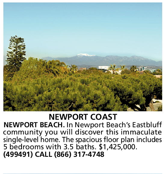 NEWPORT COAST NEWPORT BEACH. In Newport Beach’s Eastbluff community you will discover this immaculate single-level home. The spacious floor plan includes 5 bedrooms with 3.5 baths. $1,425,000. (499491) CALL (866) 317-4748