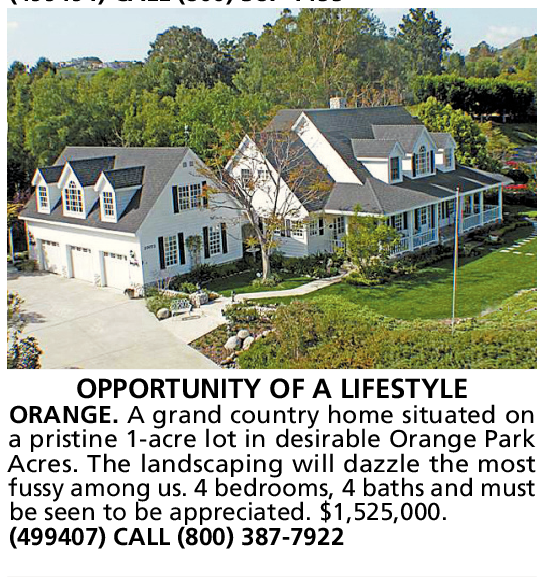 OPPORTUNITY OF A LIFESTYLE ORANGE. A grand country home situated on a pristine 1-acre lot in desirable Orange Park Acres. The landscaping will dazzle the most fussy among us. 4 bedrooms, 4 baths and must be seen to be appreciated. $1,525,000. (499407) CALL (800) 387-7922