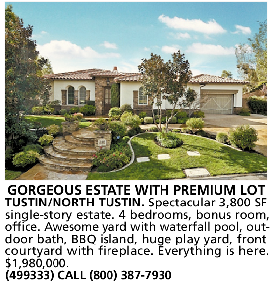GORGEOUS ESTATE WITH PREMIUM LOT TUSTIN/NORTH TUSTIN. Spectacular 3,800 SF single-story estate. 4 bedrooms, bonus room, office. Awesome yard with waterfall pool, outdoor bath, BBQ island, huge play yard, front courtyard with fireplace. Everything is here. $1,980,000. (499333) CALL (800) 387-7930