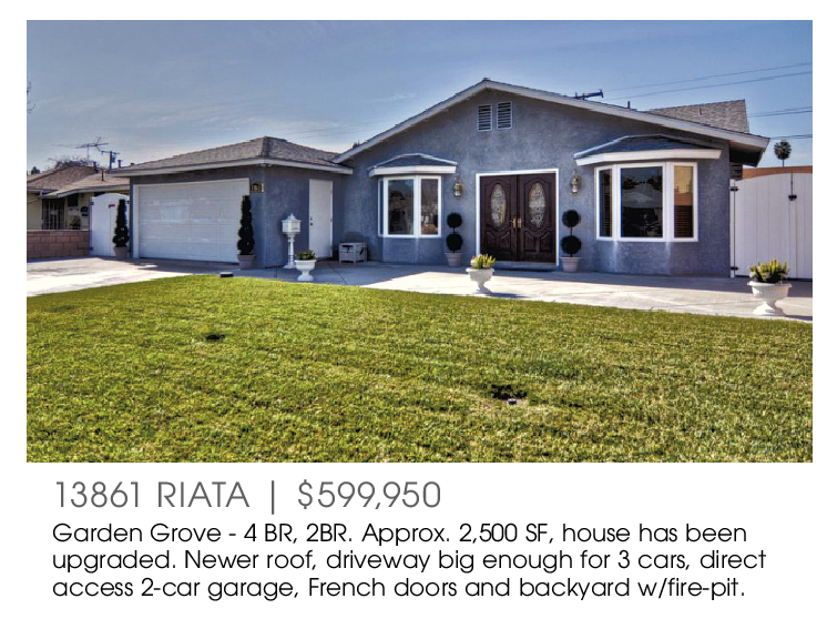13861 RIATA | $599,950 Garden Grove - 4 BR, 2BR. Approx. 2,500 SF, house has been upgraded. Newer roof, driveway big enough for 3 cars, direct access 2-car garage, French doors and backyard w/fire-pit.