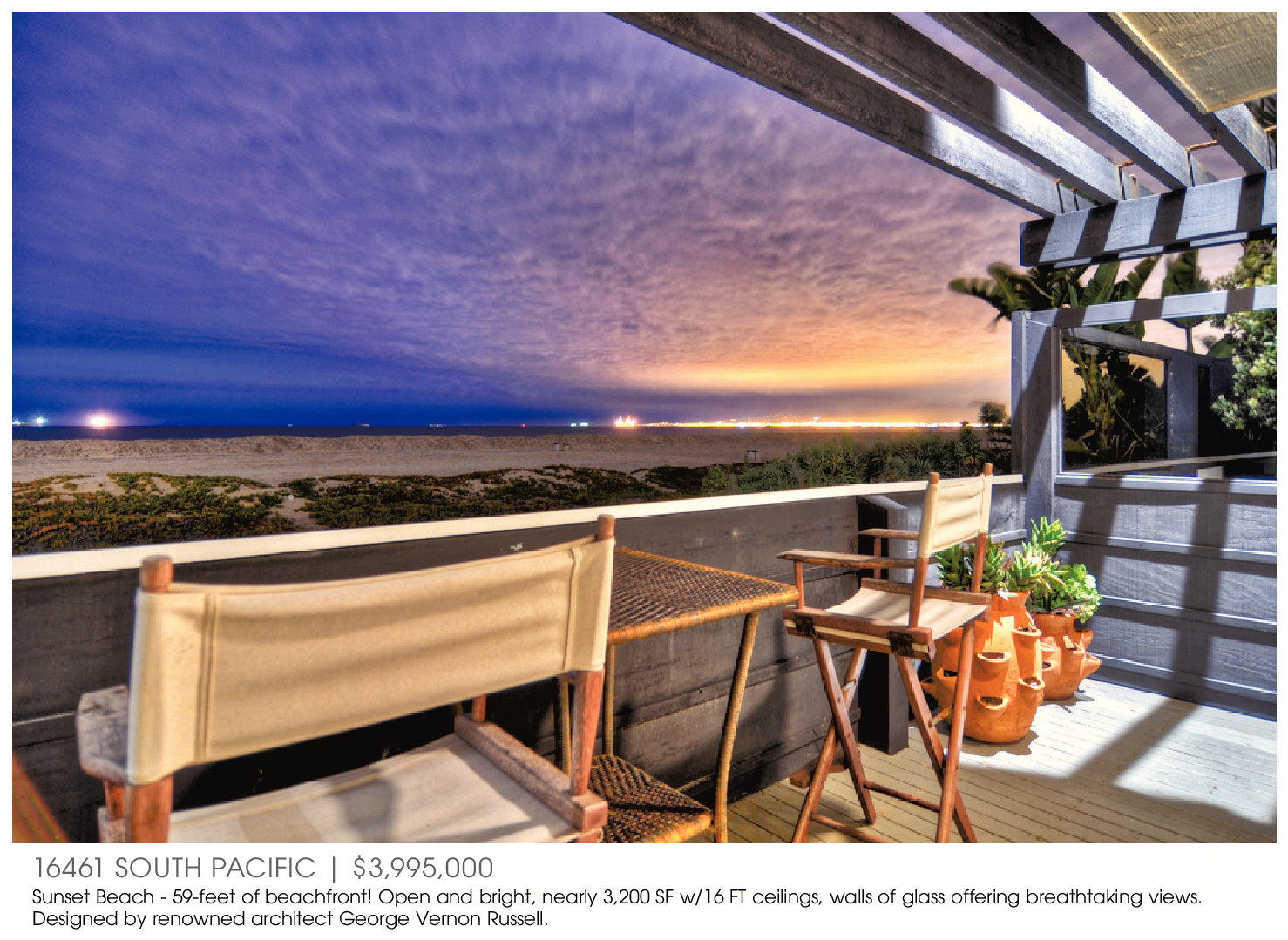 16461 SOUTH PACIFIC | $3,995,000 Sunset Beach - 59-feet of beachfront! Open and bright, nearly 3,200 SF w/16 FT ceilings, walls of glass offering breathtaking views. Designed by renowned architect George Vernon Russell.