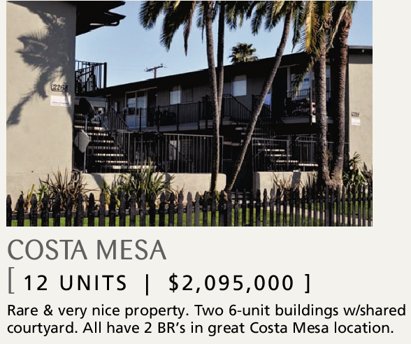 Rare & very nice property. Two 6-unit buildings w/shared courtyard. All have 2 BR’s in great Costa Mesa location.