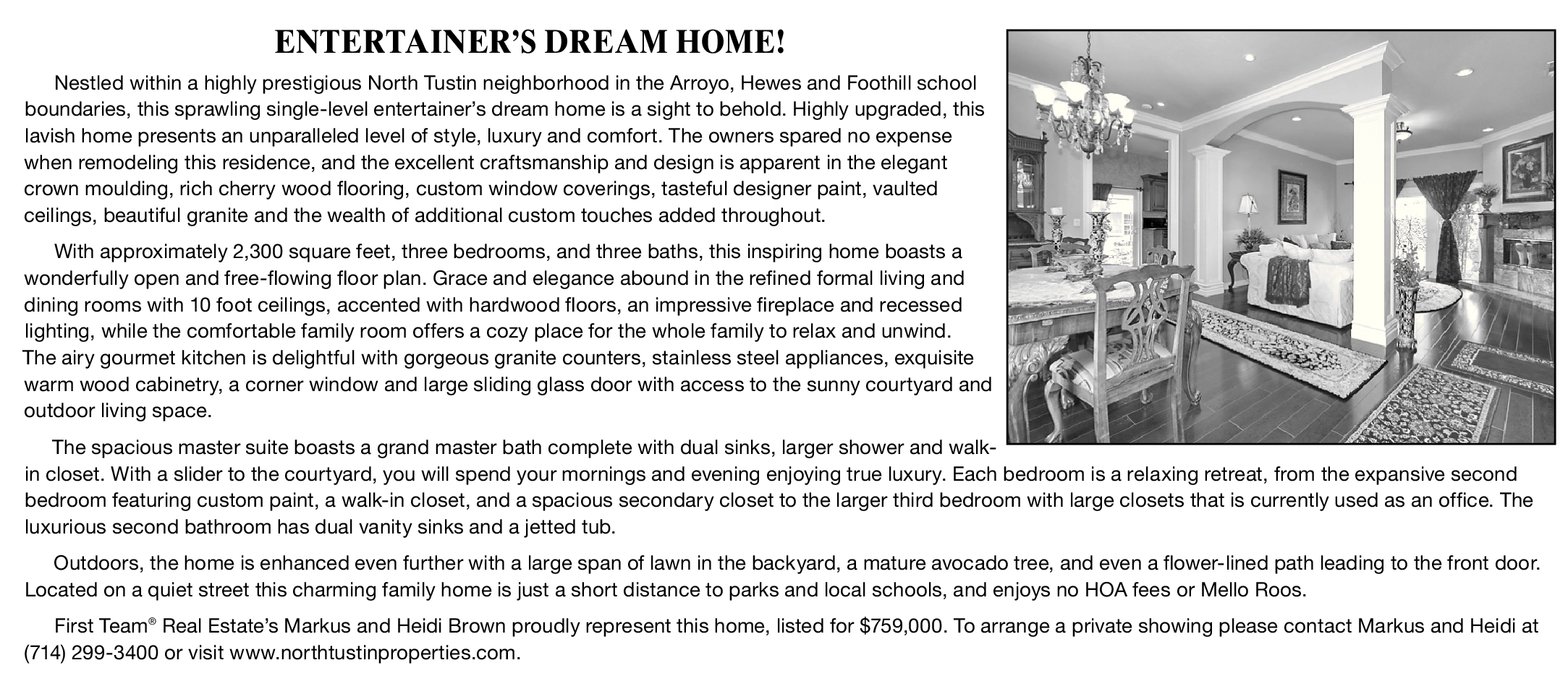 First Team ® Real Estate’s Markus and Heidi Brown proudly represent this home, listed for $759,000. To arrange a private showing please contact Markus and Heidi at (714) 299-3400 or visit www.northtustinproperties.com.