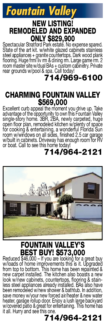 CHARMING FOUNTAIN VALLEY $569,000 Excellent curb appeal the moment you drive up. Take advantage of the opportunity to own this Fountain Valley single-story home. 3BR, 2BA, newly carpeted, huge open floor plan, remodeled kitchen w/plenty of space for cooking & entertaining, a wonderful Florida Sun room w/windows on all sides, finished 2.5 car garage w/built in cabinets. Driveway has enough room for RV or boat. Call to see this home today!
