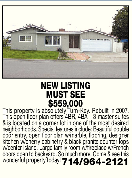 NEW LISTING MUST SEE $559,000 This property is absolutely Turn-Key. Rebuilt in 2007. This open floor plan offers 4BR, 4BA – 3 master suites & is located on a corner lot in one of the most desired neighborhoods. Special features include: Beautiful double door entry, open floor plan w/marble, flooring, designer kitchen w/cherry cabinetry & black granite counter tops w/center island. Large family room w/fireplace w/French doors open to backyard. So much more. Come & see this wonderful property today! 714/964-2121