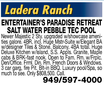 ENTERTAINER’S PARADISE RETREAT SALT WATER PEBBLE TEC POOL Newer Majestic 2 Sty. upgraded w/showcase amenities galore. 4BR, incl. Huge Mstr-Suite w/Elegant BA w/designer Tiles & Stone. Balcony. 4BA total. Huge Deluxe Kitchen w/island, S.S. Appls. Granite, Maple cabs & BRK-fast nook. Open to Fam. Rm. w/Frplc. Den/Office. Frml. Din. Rm. French Doors & Windows. 3 car garg, fire Pit. Blt-in BBQ. Luxury pool/Spa, so much to see. Only $808,500. Call.
