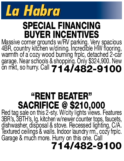 “RENT BEATER” SACRIFICE @ $210,000 Red tag sale on this 2-sty. W/city lights views. Features 3BR’s, 3BTH’s, lg. kitchen w/newer counter tops, faucets, dishwasher, disposal & stove. Recessed lighting, C/A. Textured ceilings & walls. Indoor laundry rm., cozy frplc. Garage & much more. Hurry on this one. Call 714/482-9100