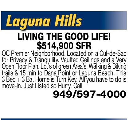 Laguna Hills LIVING THE GOOD LIFE! $514,900 SFR OC Premier Neighborhood. Located on a Cul-de-Sac for Privacy & Tranquility. Vaulted Ceilings and a Very Open Floor Plan. Lot’s of green Area’s, Walking & Biking trails & 15 min to Dana Point or Laguna Beach. This 3 Bed + 3 Ba. Home is Turn Key. All you have to do is move-in. Just Listed so Hurry. Call 949/597-4000
