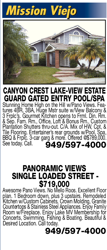 Mission Viejo CANYON CREST LAKE-VIEW ESTATE GUARD GATED ENTRY POOL/SPA Stunning Home High on the Hill w/Pano Views. Features 4BR, 3BA, Huge Mstr suite w/View Balcony & 3 Frplc’s. Gourmet Kitchen opens to Frml. Din. Rm. & Sep. Fam. Rm., Office, Loft & Bonus Rm., Custom Plantation Shutters thru-out. C/A. Mix of HW, Cpt, & Tile Flooring. Entertainer’s rear grounds w/Pool, Spa, BBQ & Frplc. 3-car garg & more. Offered @$789,000. See today. Call. 949/597-4000 PANORAMIC VIEWS SINGLE LOADED STREET - $719,000 Awesome Pano Views. No Mello Roos. Excellent Floor plan. 1 Bedroom down, plus 3 upstairs. Remodeled Kitchen w/Custom Cabinets, Crown Molding, Granite Countertops & Stainless Steel Appliances. Enjoy Family Room w/Fireplace. Enjoy Lake MV Membership for Concerts, Swimming, Fishing & Boating. Beautiful & Desired Location. Call today. 949/597-4000