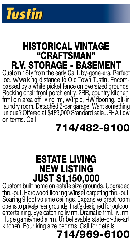 Tustin HISTORICAL VINTAGE “CRAFTSMAN” R.V. STORAGE - BASEMENT Custom 1Sty from the early Calif. by-gone-era. Perfect loc. w/walking distance to Old Town Tustin. Encompassed by a white picket fence on oversized grounds. Rocking chair front porch entry. 2BR, country kitchen, frml din area off living rm, w/frplc, HW flooring, blt-in laundry room. Detached 2-car garage. Want something unique? Offered at $489,000 Standard sale...FHA Low on terms. Call 714/482-9100 ESTATE LIVING NEW LISTING JUST $1,150,000 Custom built home on estate size grounds. Upgraded thru-out. Hardwood flooring w/inset carpeting thru-out. Soaring 9 foot volume ceilings. Expansive great room opens to private rear grounds, that’s designed for outdoor entertaining. Eye catching liv rm. Dramatic frml. liv. rm. Huge game/media rm. Unbelievable state-or-the-art kitchen. Four king size bedrms. Call for details. 714/969-6100