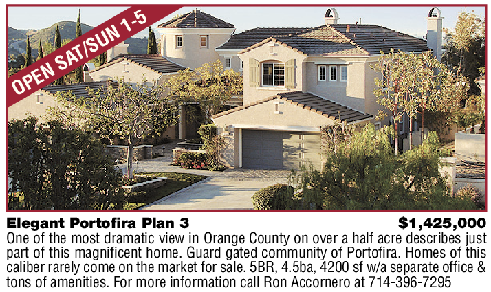 Elegant Portofira Plan 3 $1,425,000 One of the most dramatic view in Orange County on over a half acre describes just part of this magnificent home. Guard gated community of Portofira. Homes of this caliber rarely come on the market for sale. 5BR, 4.5ba, 4200 sf w/a separate office & tons of amenities. For more information call Ron Accornero at 714-396-7295
