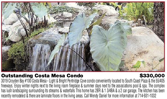 Outstanding Costa Mesa Condo $330,000 3019 Croyden Bay #100 Costa Mesa - Light & Bright Pentridge Cove condo conveniently located to South Coast Plaza & the 55/405 freeways. Enjoy winter nights next to the living room fireplace & summer days next to the associations pool & spa. The complex has lush landscaping surrounding its streams & waterfalls This home has 2BR & 1 3/4BA & a 2 car garage. The kitchen has been recently remodeled & there are laminate floors in the living areas. Call Wendy Daniel for more information at 714-931-1032