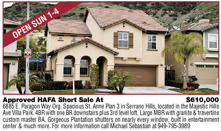 Approved HAFA Short Sale At $610,000 6885 E. Paragon Way Org. Spacious St. Anne Plan 3 in Serrano Hills, located in the Majestic Hills Ave Villa Park. 4BR with one BR downstairs plus 3rd level loft. Large MBR with granite & travertine custom master BA. Gorgeous Plantation shutters on nearly every window, built in entertainment center & much more. For more information call Michael Sebastian at 949-795-3989