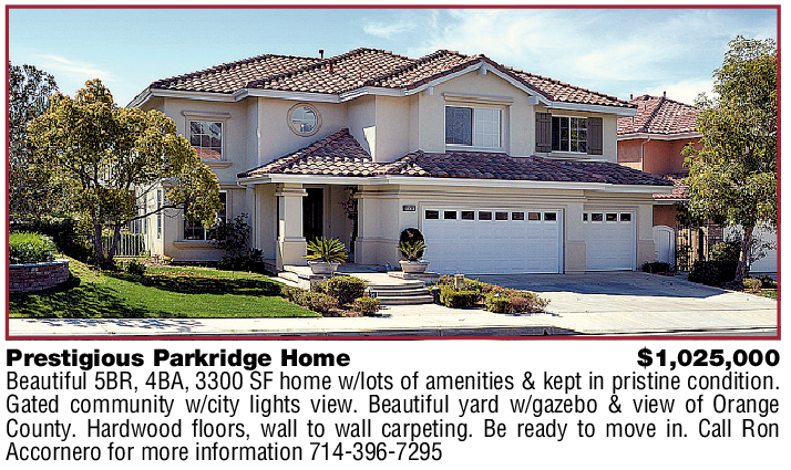 Prestigious Parkridge Home $1,025,000 Beautiful 5BR, 4BA, 3300 SF home w/lots of amenities & kept in pristine condition. Gated community w/city lights view. Beautiful yard w/gazebo & view of Orange County. Hardwood floors, wall to wall carpeting. Be ready to move in. Call Ron Accornero for more information 714-396-7295
