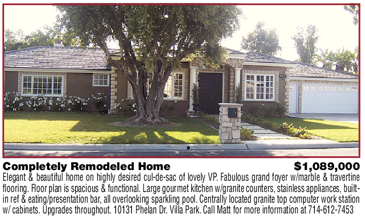 Completely Remodeled Home $1,089,000 Elegant & beautiful home on highly desired cul-de-sac of lovely VP. Fabulous grand foyer w/marble & travertine flooring. Floor plan is spacious & functional. Large gourmet kitchen w/granite counters, stainless appliances, builtin ref & eating/presentation bar, all overlooking sparkling pool. Centrally located granite top computer work station w/ cabinets. Upgrades throughout. 10131 Phelan Dr. Villa Park. Call Matt for more information at 714-612-7453