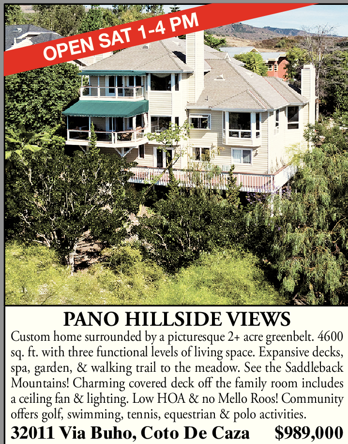 PANO HILLSIDE VIEWS Custom home surrounded by a picturesque 2+ acre greenbelt. 4600 sq. ft. with three functional levels of living space. Expansive decks, spa, garden, & walking trail to the meadow. See the Saddleback Mountains! Charming covered deck off the family room includes a ceiling fan & lighting. Low HOA & no Mello Roos! Community offers golf, swimming, tennis, equestrian & polo activities. 32011 Via Buho, Coto De Caza $989,000