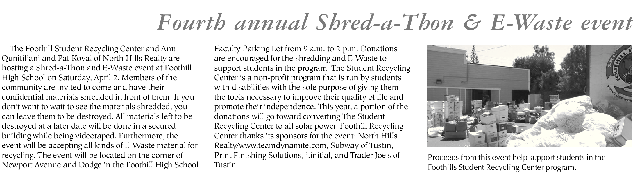 The Foothill Student Recycling Center and Ann Qunitiliani and Pat Koval of North Hills Realty are hosting a Shred-a-Thon and E-Waste event at Foothill High School on Saturday, April 2. Members of the community are invited to come and have their confidential materials shredded in front of them. If you don’t want to wait to see the materials shredded, you can leave them to be destroyed. All materials left to be destroyed at a later date will be done in a secured building while being videotaped. Furthermore, the event will be accepting all kinds of E-Waste material for recycling. The event will be located on the corner of Newport Avenue and Dodge in the Foothill High School Fourth annual Shred-a-Thon & E-Waste event Faculty Parking Lot from 9 a.m. to 2 p.m. Donations are encouraged for the shredding and E-Waste to support students in the program. The Student Recycling Center is a non-profit program that is run by students with disabilities with the sole purpose of giving them the tools necessary to improve their quality of life and promote their independence. This year, a portion of the donations will go toward converting The Student Recycling Center to all solar power. Foothill Recycling Center thanks its sponsors for the event: North Hills Realty/www.teamdynamite.com, Subway of Tustin, Print Finishing Solutions, i.initial, and Trader Joe’s of Tustin. Proceeds from this event help support students in the Foothills Student Recycling Center program.