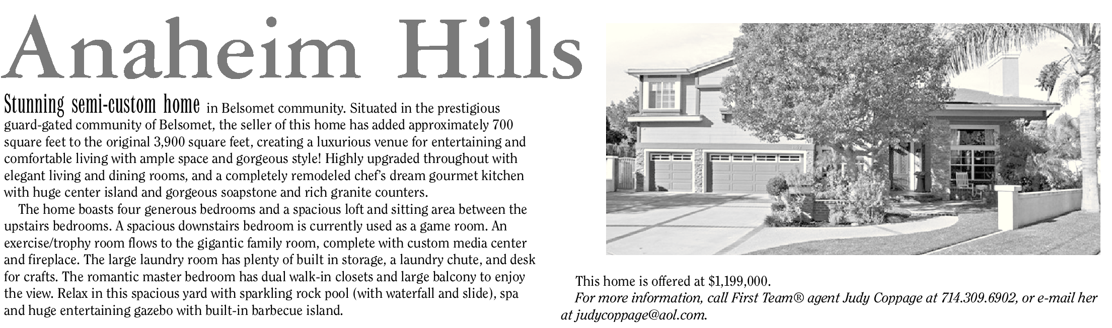 This home is offered at $1,199,000. For more information, call First Team® agent Judy Coppage at 714.309.6902, or e-mail her at judycoppage@aol.com.
