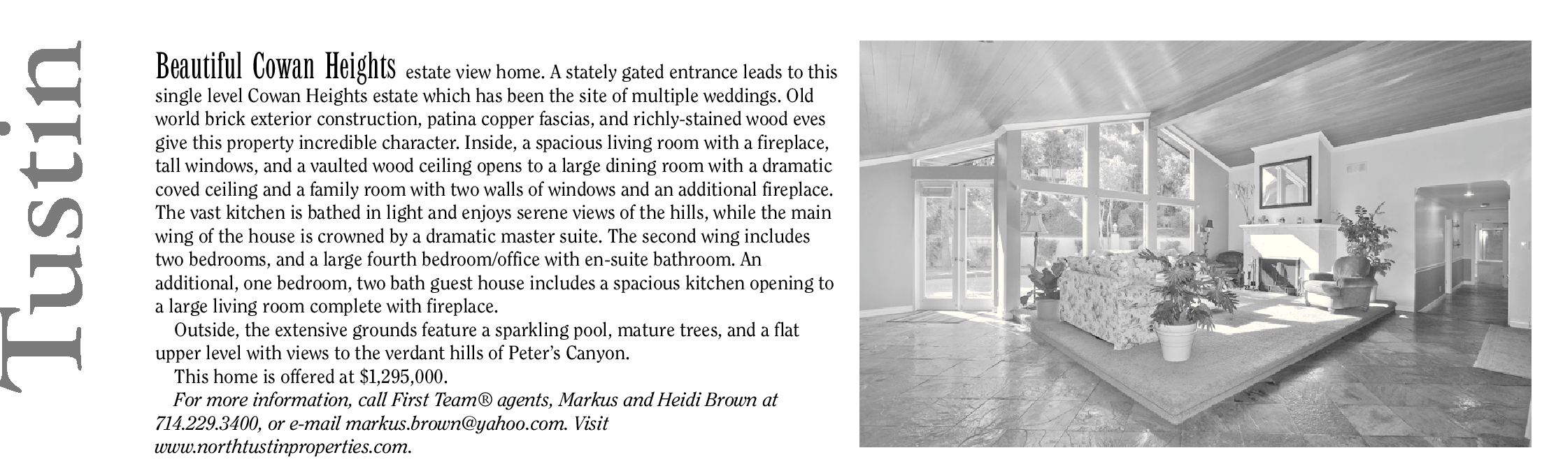 Beautiful Cowan Heights estate view home. A stately gated entrance leads to this single level Cowan Heights estate which has been the site of multiple weddings. Old world brick exterior construction, patina copper fascias, and richly-stained wood eves give this property incredible character. Inside, a spacious living room with a fireplace, tall windows, and a vaulted wood ceiling opens to a large dining room with a dramatic coved ceiling and a family room with two walls of windows and an additional fireplace. The vast kitchen is bathed in light and enjoys serene views of the hills, while the main wing of the house is crowned by a dramatic master suite. The second wing includes two bedrooms, and a large fourth bedroom/office with en-suite bathroom. An additional, one bedroom, two bath guest house includes a spacious kitchen opening to a large living room complete with fireplace. Outside, the extensive grounds feature a sparkling pool, mature trees, and a flat upper level with views to the verdant hills of Peter’s Canyon. This home is offered at $1,295,000. For more information, call First Team® agents, Markus and Heidi Brown at 714.229.3400, or e-mail markus.brown@yahoo.com. Visit www.northtustinproperties.com.