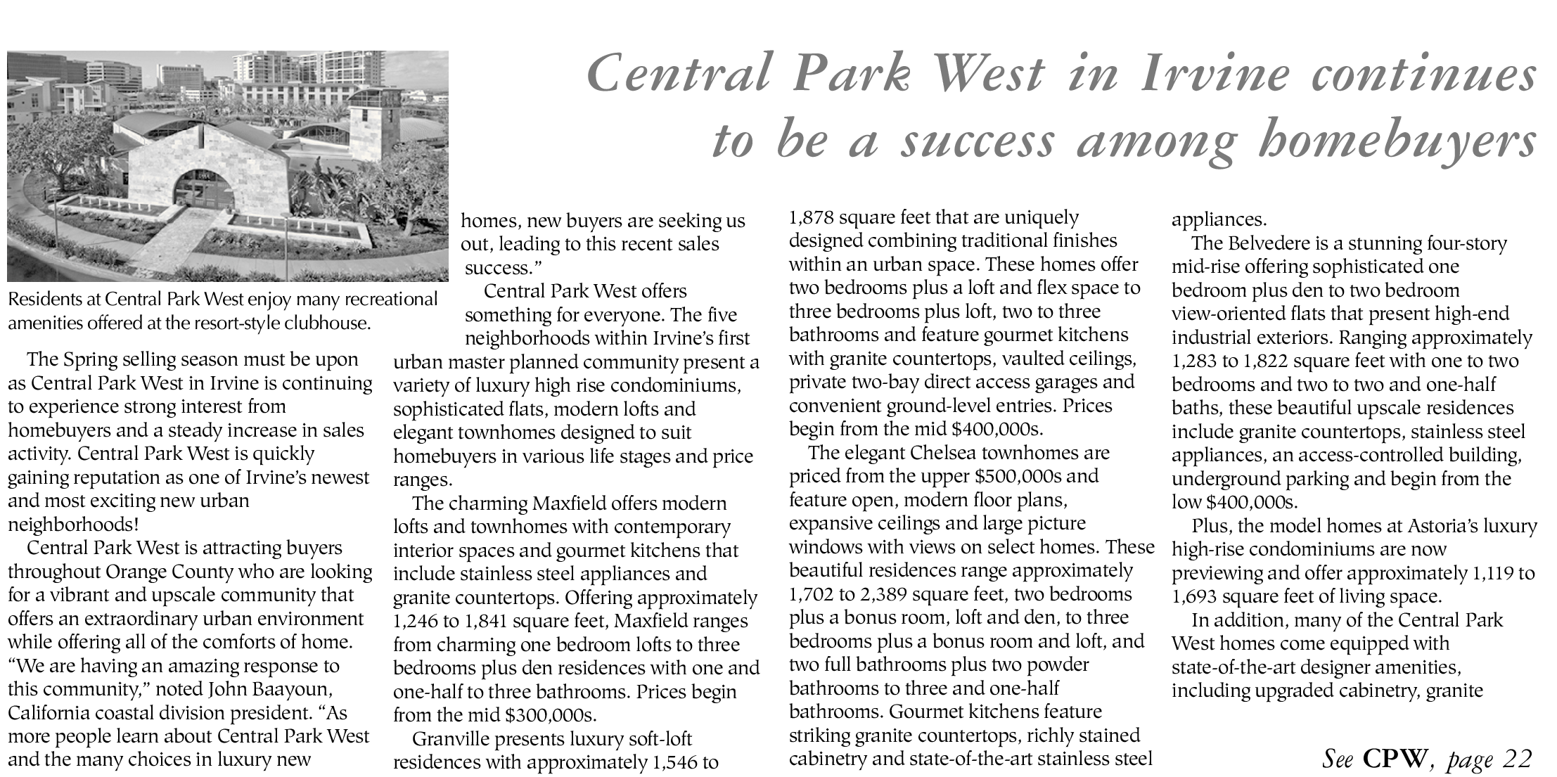 Central Park West is attracting buyers throughout Orange County who are looking for a vibrant and upscale community that offers an extraordinary urban environment while offering all of the comforts of home. “We are having an amazing response to this community,” noted John Baayoun, California coastal division president. “As more people learn about Central Park West and the many choices in luxury new