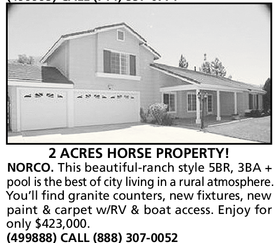 NORCO. This beautiful-ranch style 5BR, 3BA + pool is the best of city living in a rural atmosphere. You’ll find granite counters, new fixtures, new paint & carpet w/RV & boat access. Enjoy for only $423,000.