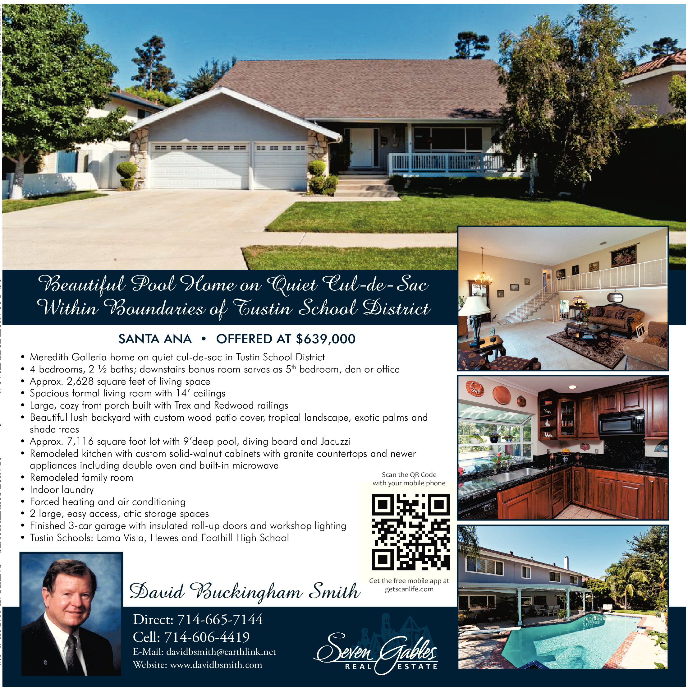 18 Beautiful Pool Home on Quiet Cul-de-Sac Within Boundaries of Tustin School District Santa ana • Offered at $639,000 • Meredith Galleria home on quiet cul-de-sac in Tustin School District th • 4 bedrooms, 2 ½ baths; downstairs bonus room serves as 5 bedroom, den or office • Approx. 2,628 square feet of living space • Spacious formal living room with 14’ ceilings • Large, cozy front porch built with Trex and Redwood railings • Beautiful lush backyard with custom wood patio cover, tropical landscape, exotic palms and shade trees • Approx. 7,116 square foot lot with 9’deep pool, diving board and Jacuzzi • Remodeled kitchen with custom solid-walnut cabinets with granite countertops and newer appliances including double oven and built-in microwave • Remodeled family room • Indoor laundry • Forced heating and air conditioning • 2 large, easy access, attic storage spaces • Finished 3-car garage with insulated roll-up doors and workshop lighting • Tustin Schools: Loma Vista, Hewes and Foothill High School David Buckingham Smith Direct: 714-665-7144 Cell: 714-606-4419 E-Mail: davidbsmith@earthlink.net Website: www.davidbsmith.com Scan the QR Code with your mobile phone Get the free mobile app at getscanlife.com R E A L E S T A T E