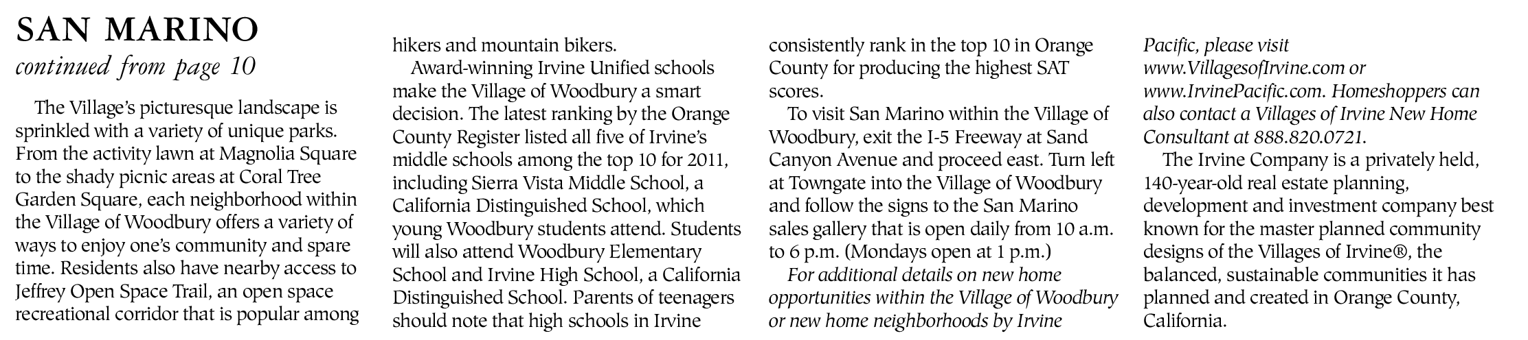 To visit San Marino within the Village of Woodbury, exit the I-5 Freeway at Sand Canyon Avenue and proceed east. Turn left at Towngate into the Village of Woodbury and follow the signs to the San Marino sales gallery that is open daily from 10 a.m. to 6 p.m. (Mondays open at 1 p.m.)