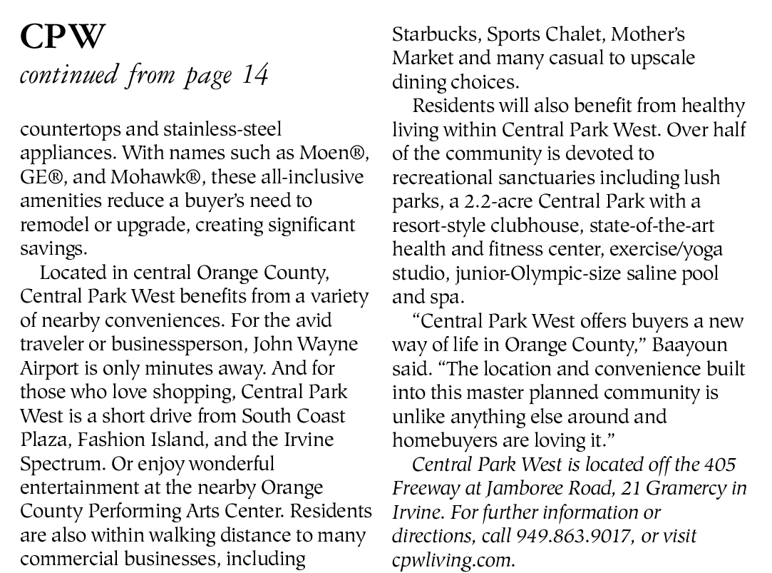 Central Park West is located off the 405 Freeway at Jamboree Road, 21 Gramercy in Irvine. For further information or directions, call 949.863.9017, or visit cpwliving.com.