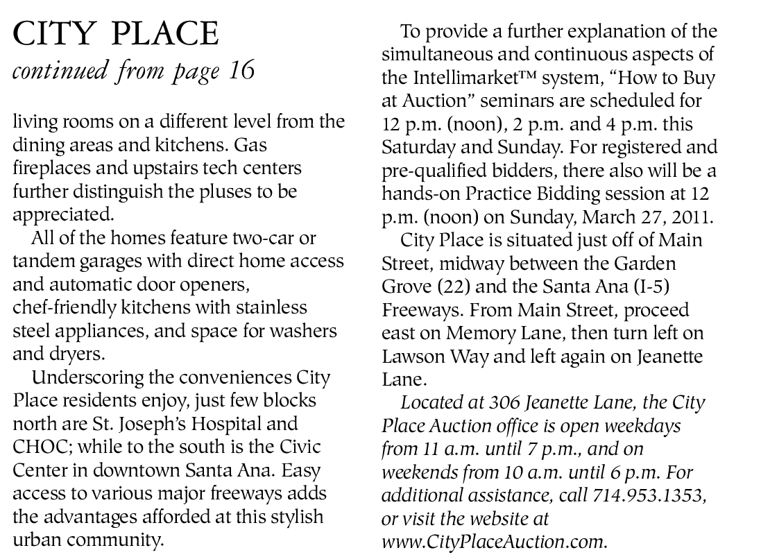 Located at 306 Jeanette Lane, the City Place Auction office is open weekdays from 11 a.m. until 7 p.m., and on weekends from 10 a.m. until 6 p.m. For additional assistance, call 714.953.1353, or visit the website at www.CityPlaceAuction.com.