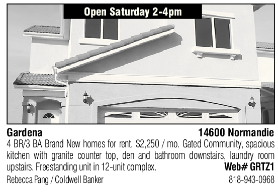 Open Saturday 2-4pm Gardena 14600 Normandie 4 BR/3 BA Brand New homes for rent. $2,250 / mo. Gated Community, spacious kitchen with granite counter top, den and bathroom downstairs, laundry room upstairs. Freestanding unit in 12-unit complex. Web# GRTZ1 Rebecca Pang / Coldwell Banker 818-943-0968