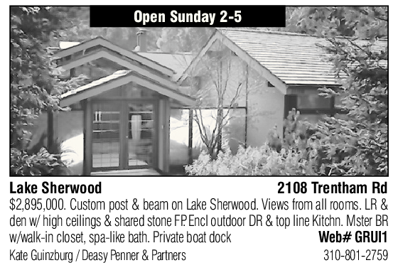 Lake Sherwood 2108 Trentham Rd den w/ high ceilings & shared stone FP. Encl outdoor DR & top line Kitchn. Mster BR $2,895,000. Custom post & beam on Lake Sherwood. Views from all rooms. LR & w/walk-in closet, spa-like bath. Private boat dock Web# GRUI1 Kate Guinzburg / Deasy Penner & Partners 310-801-2759