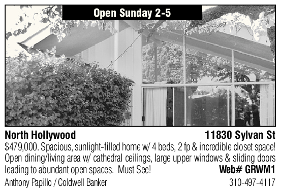 Open Sunday 2-5 North Hollywood 11830 Sylvan St $479,000. Spacious, sunlight-filled home w/ 4 beds, 2 fp & incredible closet space! Open dining/living area w/ cathedral ceilings, large upper windows & sliding doors leading to abundant open spaces. Must See! Web# GRWM1 Anthony Papillo / Coldwell Banker 310-497-4117 See also