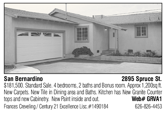 San Bernardino 2895 Spruce St. $181,500. Standard Sale. 4 bedrooms, 2 baths and Bonus room. Approx 1,200sq ft. New Carpets. New Tile in Dining area and Baths. Kitchen has New Granite Counter tops and new Cabinetry. New Paint inside and out. Web# GRVA1 Frances Creveling / Century 21 Excellence Lisc.#1490184 626-826-4453