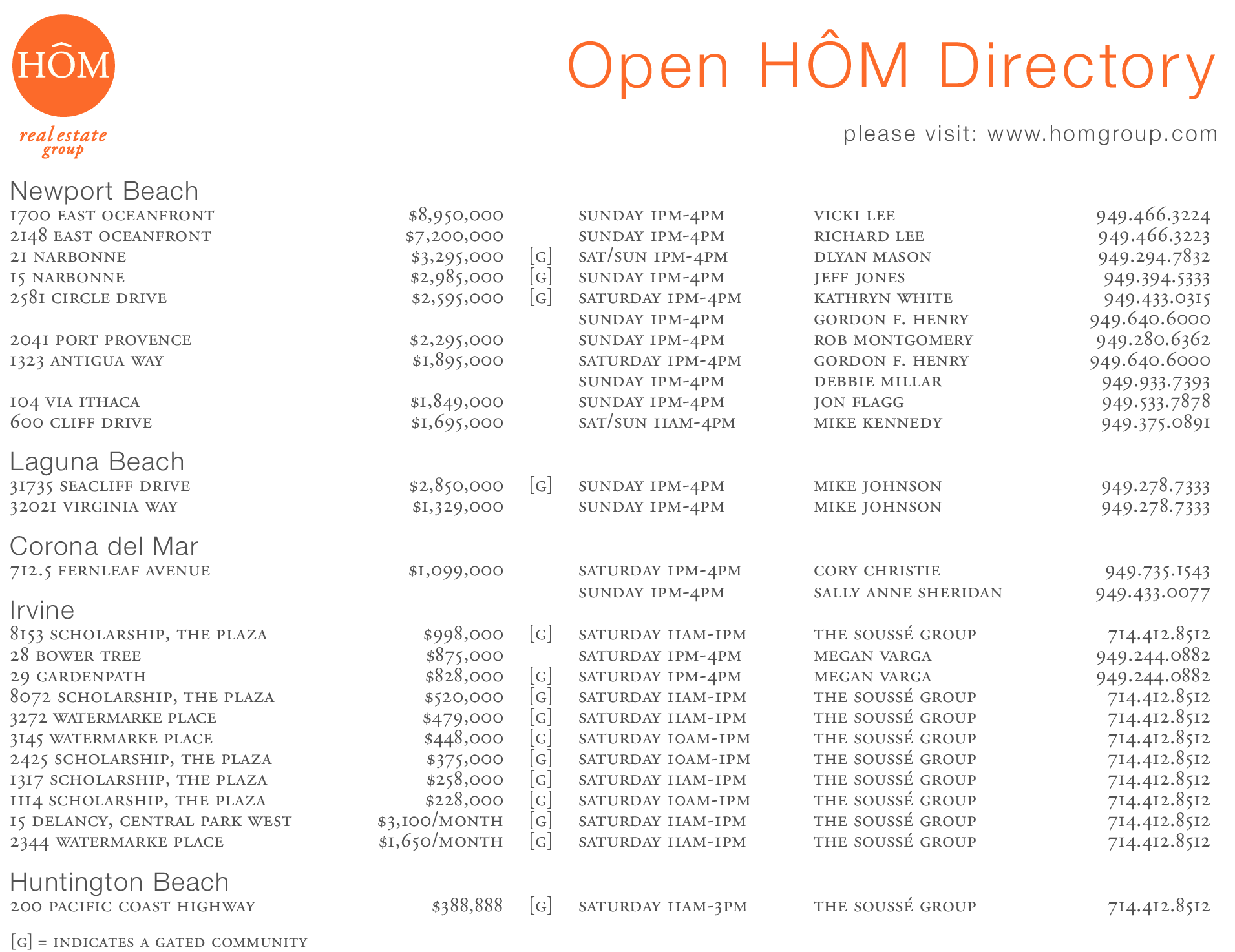 1700 east oceanfront $8,950,000 sunday 1pm-4pm vicki lee 949.466.3224 2148 east oceanfront $7,200,000 sunday 1pm-4pm richard lee 949.466.3223 21 narbonne $3,295,000 [g] sat/sun 1pm-4pm dlyan mason 949.294.7832 15 narbonne $2,985,000 [g] sunday 1pm-4pm jeff jones 949.394.5333 2581 circle drive $2,595,000 [g] saturday 1pm-4pm kathryn white 949.433.0315 sunday 1pm-4pm gordon f. henry 949.640.6000 2041 port provence $2,295,000 sunday 1pm-4pm rob montgomery 949.280.6362 1323 antigua way $1,895,000 saturday 1pm-4pm gordon f. henry 949.640.6000 sunday 1pm-4pm debbie millar 949.933.7393 104 via ithaca $1,849,000 sunday 1pm-4pm jon flagg 949.533.7878 600 cliff drive $1,695,000 sat/sun 11am-4pm mike kennedy 949.375.0891