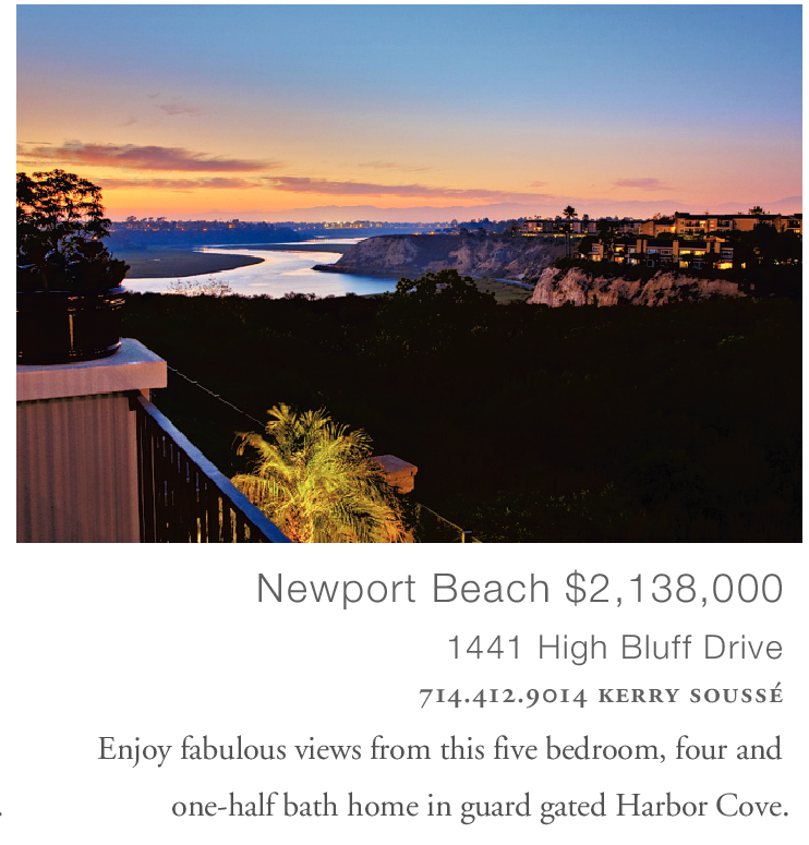 Newport Beach $2,138,000 1441 High Bluff Drive 714.412.9014 kerry soussé Enjoy fabulous views from this five bedroom, four and one-half bath home in guard gated Harbor Cove.