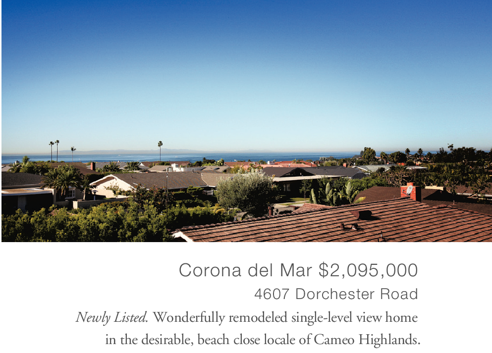 Corona del Mar $2,095,000 4607 Dorchester Road Newly Listed. Wonderfully remodeled single-level view home in the desirable, beach close locale of Cameo Highlands.