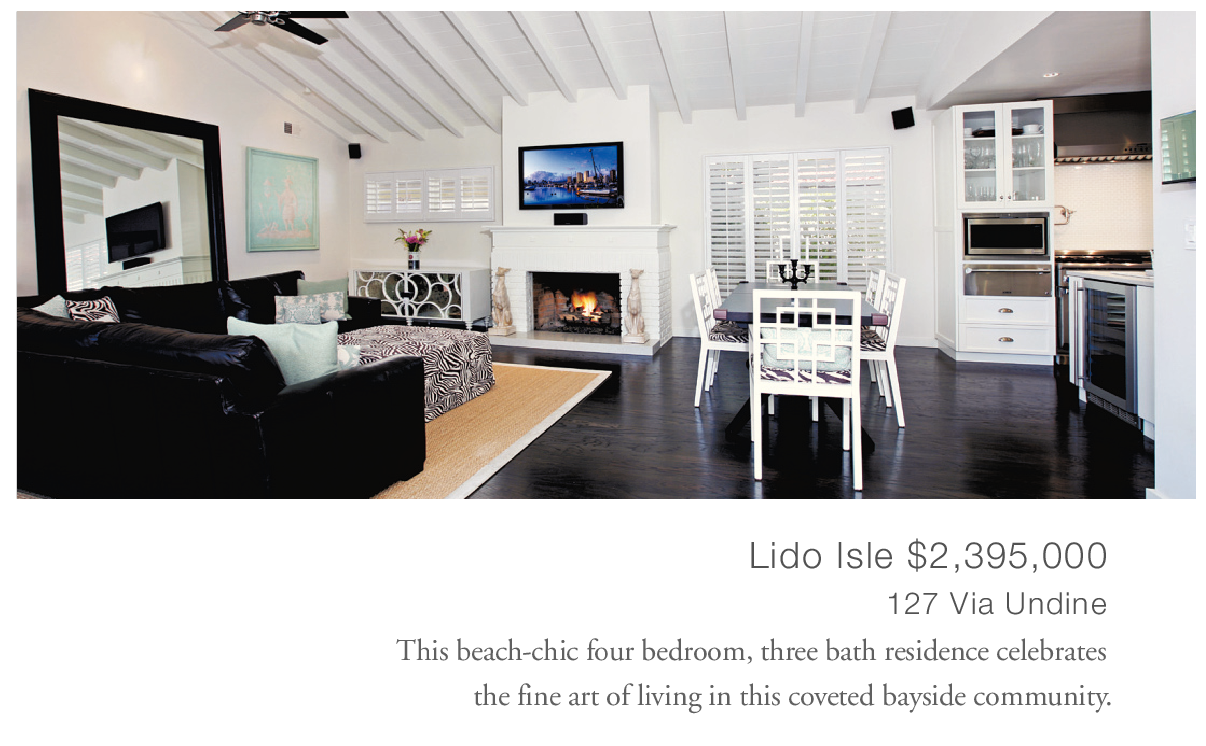 Lido Isle $2,395,000 127 Via Undine This beach-chic four bedroom, three bath residence celebrates the fine art of living in this coveted bayside community.