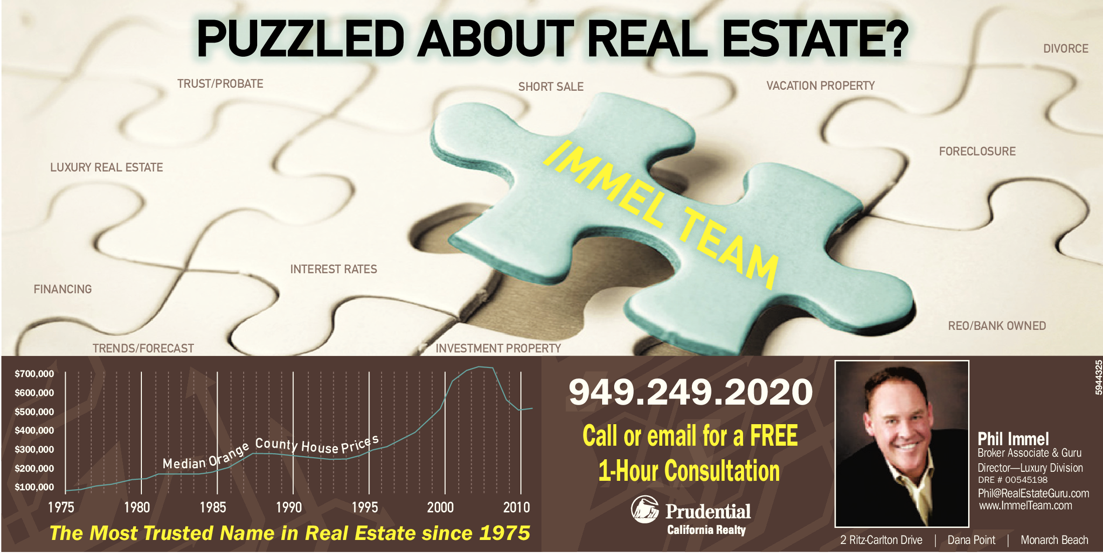 $700,000 $600,000 $500,000 $400,000 $300,000 $200,000 $100,000 LUXURY REAL ESTATE FINANCING Media1975 1980 1985 1990 1995 2000 2010 PUZZLED ABOUT REAL ESTATE? TRUST/PROBATE SHORT SALE VACATION PROPERTY INTEREST RATES TRENDS/FORECAST INVESTMENT PROPERTY The Most Trusted Name in Real Estate since 1975 949.249.2020 Call or email for a FREE 1-Hour Consultation FORECLOSURE REO/BANK OWNED Phil Immel Broker Associate & Guru Director—Luxury Division DRE # 00545198 DIVORCE Phil@RealEstateGuru.com www.ImmelTeam.com 2 Ritz-Carlton Drive | Dana Point | Monarch Beach