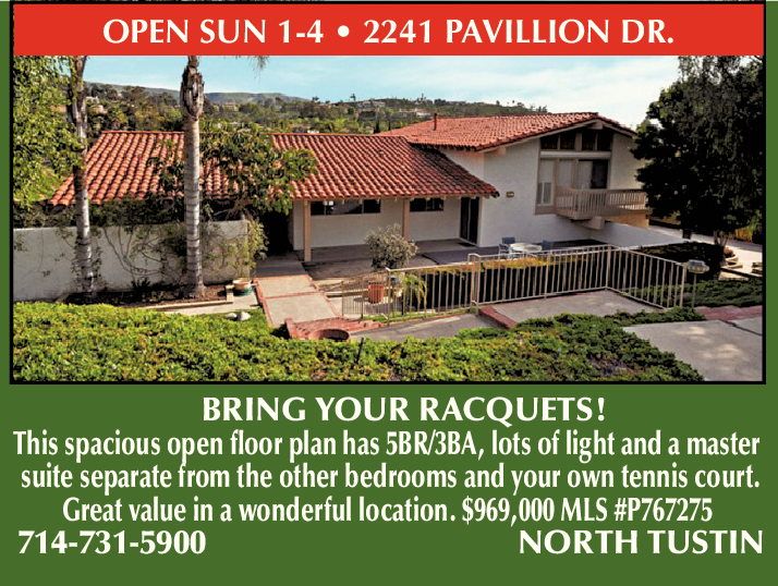 OPEN SUN 1-4 • 2241 PAVILLION DR. BRING YOUR RACQUETS! This spacious open floor plan has 5BR/3BA, lots of light and a master suite separate from the other bedrooms and your own tennis court. Great value in a wonderful location. $969,000 MLS #P767275 714-731-5900 NORTH TUSTIN
