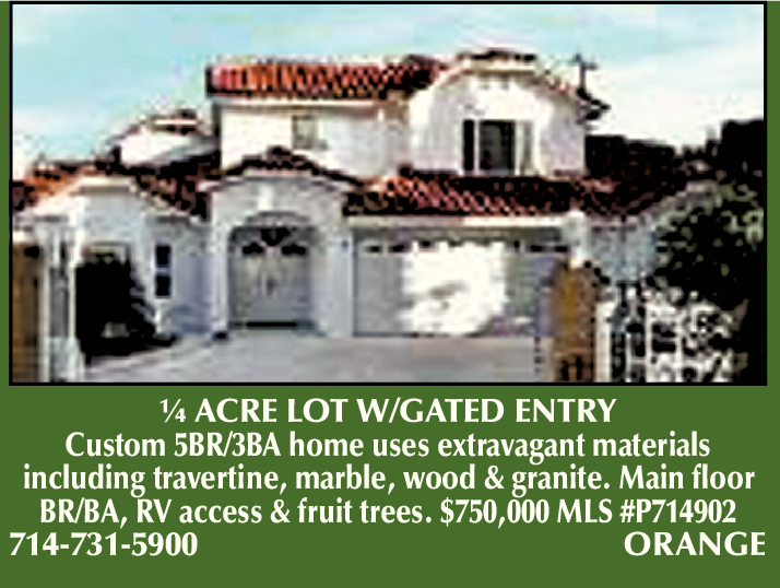 ¼ ACRE LOT W/GATED ENTRY Custom 5BR/3BA home uses extravagant materials including travertine, marble, wood & granite. Main floor BR/BA, RV access & fruit trees. $750,000 MLS #P714902 714-731-5900 ORANGE