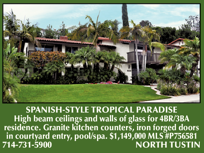 SPANISH-STYLE TROPICAL PARADISE High beam ceilings and walls of glass for 4BR/3BA residence. Granite kitchen counters, iron forged doors in courtyard entry, pool/spa. $1,149,000 MLS #P756581 714-731-5900 NORTH TUSTIN