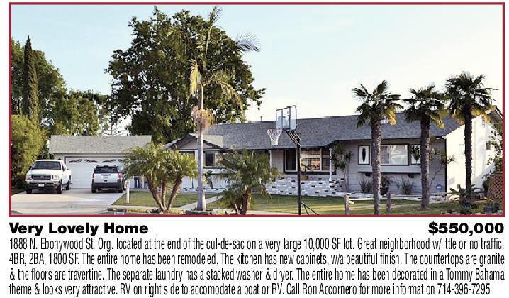 Very Lovely Home $550,000 1888 N. Ebonywood St. Org. located at the end of the cul-de-sac on a very large 10,000 SF lot. Great neighborhood w/little or no traffic. 4BR, 2BA, 1800 SF. The entire home has been remodeled. The kitchen has new cabinets, w/a beautiful finish. The countertops are granite & the floors are travertine. The separate laundry has a stacked washer & dryer. The entire home has been decorated in a Tommy Bahama theme & looks very attractive. RV on right side to accomodate a boat or RV. Call Ron Accornero for more information 714-396-7295