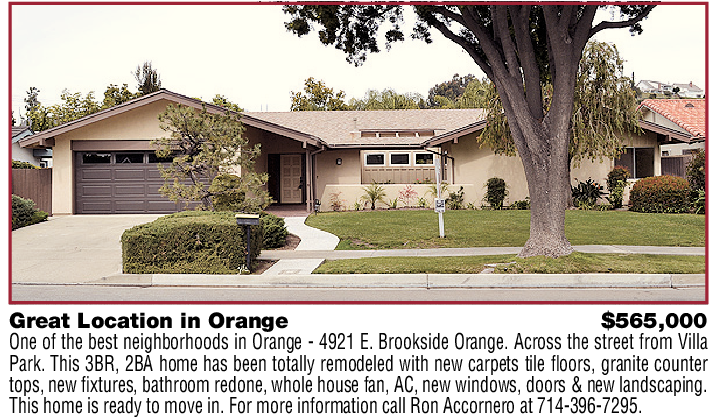 Great Location in Orange $565,000 One of the best neighborhoods in Orange - 4921 E. Brookside Orange. Across the street from Villa Park. This 3BR, 2BA home has been totally remodeled with new carpets tile floors, granite counter tops, new fixtures, bathroom redone, whole house fan, AC, new windows, doors & new landscaping. This home is ready to move in. For more information call Ron Accornero at 714-396-7295.