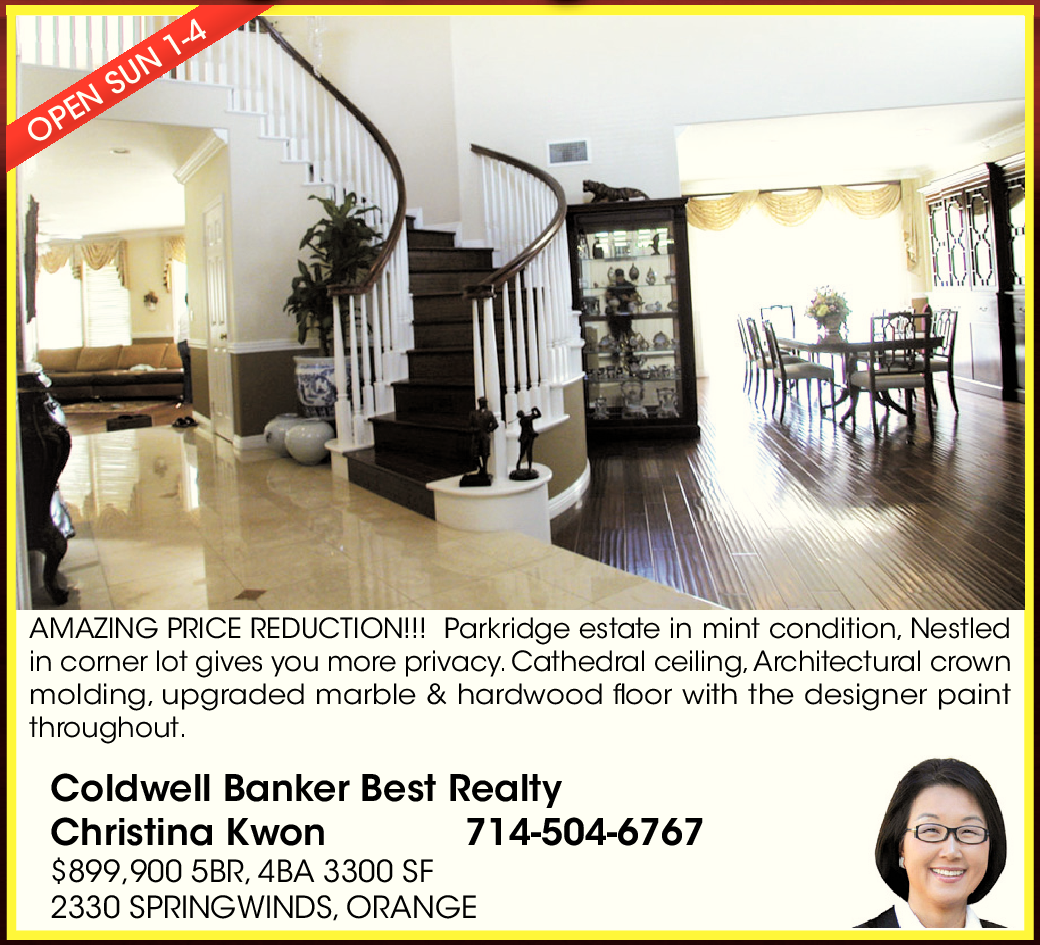 AMAZING PRICE REDUCTION!!! Parkridge estate in mint condition, Nestled in corner lot gives you more privacy. Cathedral ceiling,Architectural crown molding, upgraded marble & hardwood floor with the designer paint throughout. Coldwell Banker Best Realty Christina Kwon 714-504-6767 $899,900 5BR, 4BA 3300 SF 2330 SPRINGWINDS, ORANGE